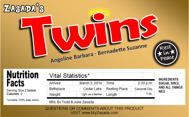 Summer 2016 After many, many months, the twins finally have names: Baby A is Angeline Barbara and Baby B is Bernadette Suzanne. As a result, they have their own Zasada custom candy bar wrapper now too.
